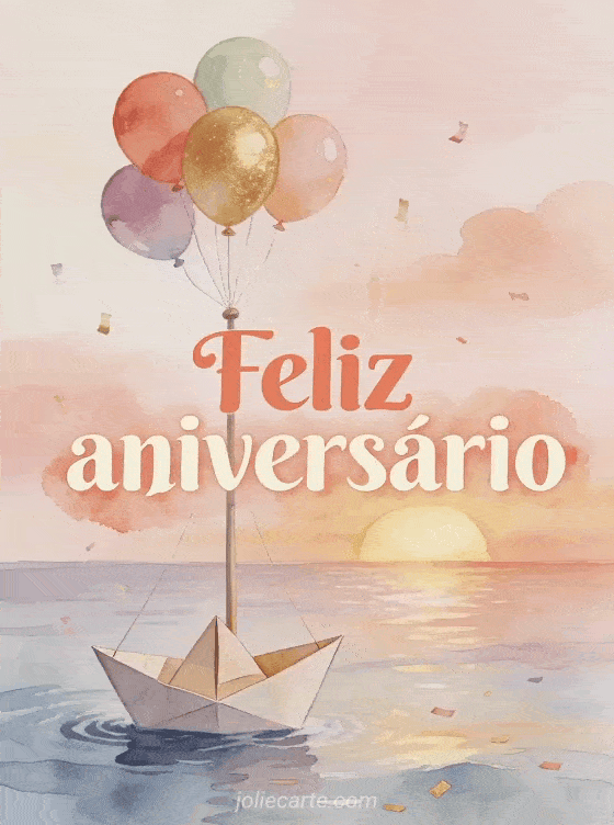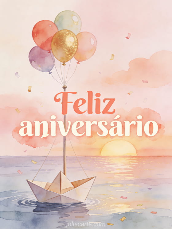 Envie desejos doces de aniversário para um bebê com uma ilustração suave de um barquinho de papel navegando em um mar calmo, balões coloridos amarrados ao mastro, luz de pôr do sol pastel e confetes flutuando como espuma. Veja também feliz aniversário meu bebê 2 anos, texto aniversário bebê 1 ano ou feliz aniversário bebê.