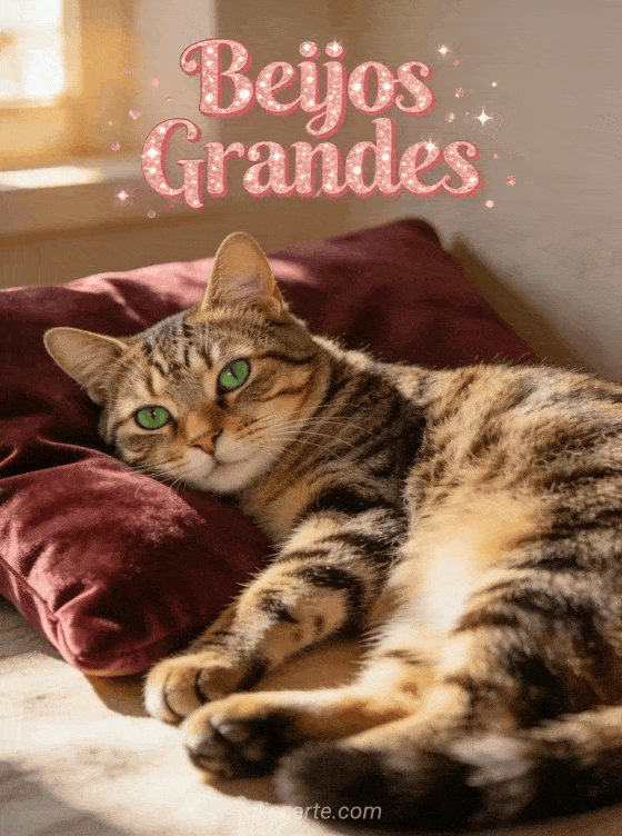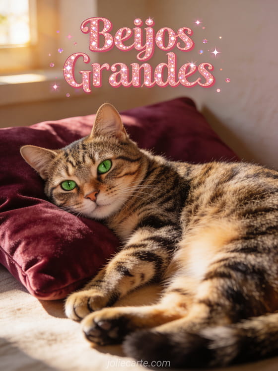 Envie um terno cartão de beijos grandes para alguém querido. Um gato rajado de olhos verdes descansa sobre uma almofada de veludo bordô, banhado na luz quente da tarde. Descubra também um cartão de super beijos ou um cartão de beijos com gatos.