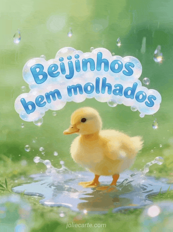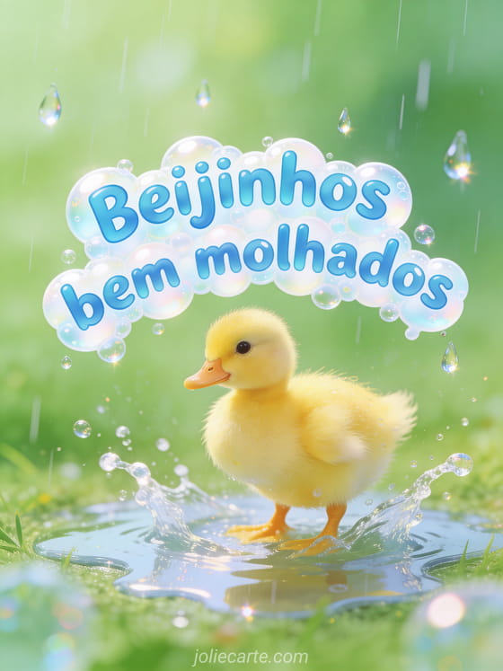Envie alegres beijinhos bem molhados com este encantador cartão com um adorável patinho amarelo numa poça sob a chuva. Descubra também desenho menina beijinhos ou foca beijinhos.