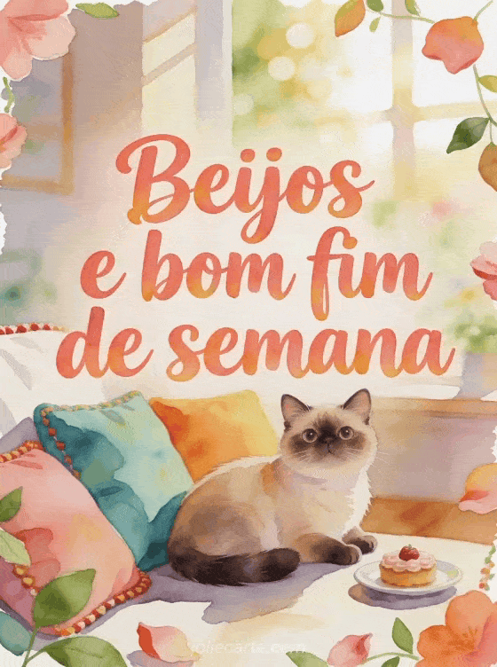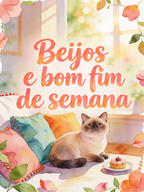 Envie um cartão aconchegante de fim de semana com letras alegres em aquarela, um gato exotic shorthair, almofadas coloridas e um pratinho de confeitaria. Veja também um bom fim de semana beijos gif, um bom fim de semana humor ou um bom fim de semana animado beijos.