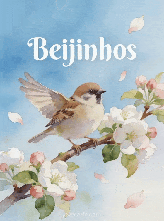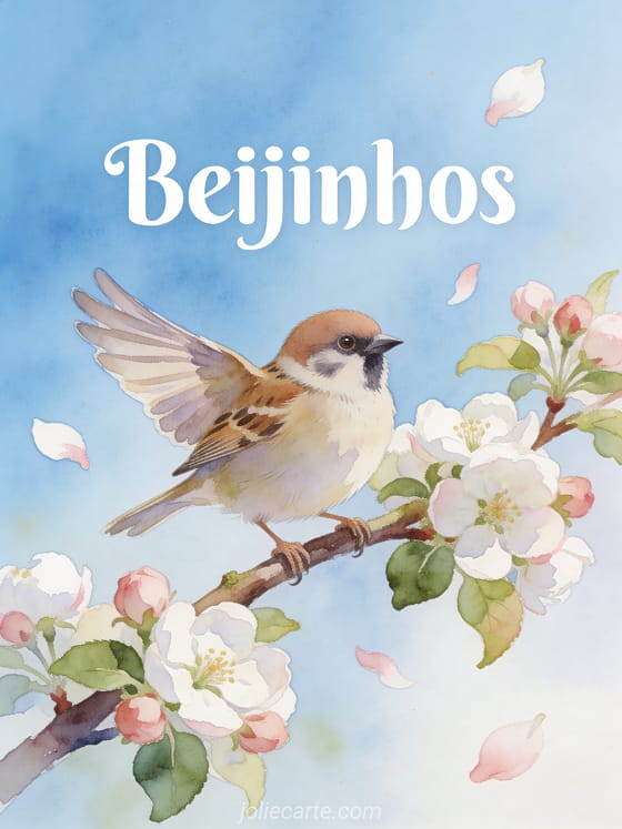 Envie ternos beijinhos com este delicado cartão aquarela com um adorável pardal pousado num galho de macieira em flor. Descubra também sms cheios de beijinhos ou beijinhos bem molhados.