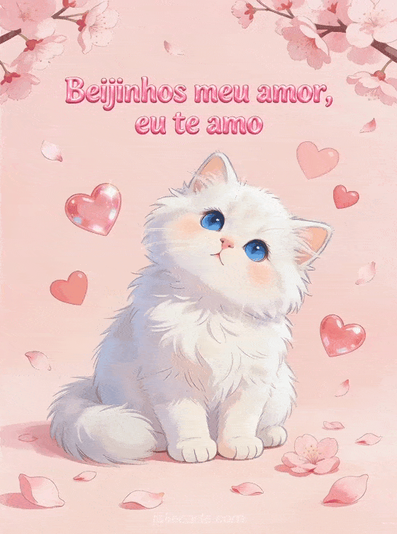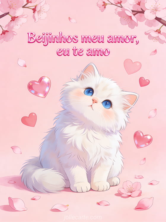 Envie doces beijinhos para o seu amor com este adorável cartão com um gatinho persa branco cercado de corações rosas e pétalas de cerejeira. Descubra também um lindo cartão de amor ou um cartão de amor fofo.