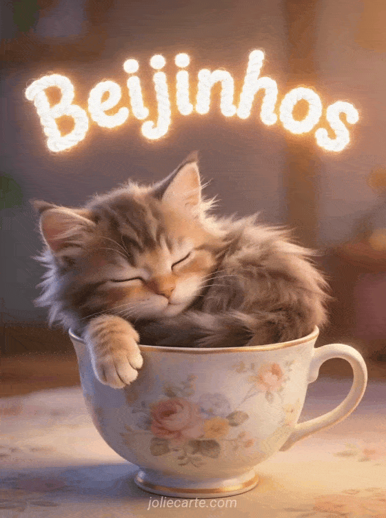 Compartilhe uma doce mensagem de beijinhos com este adorável cartão que mostra um pequeno gatinho Maine Coon dormindo dentro de uma grande xícara de porcelana florida. Você também pode descobrir beijos meu coração gif, beijos ai grátis ou imagem beijos.