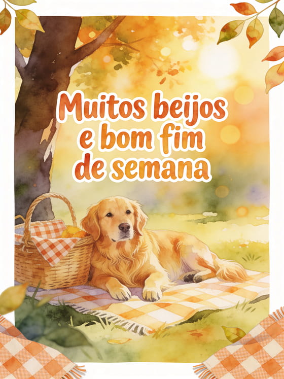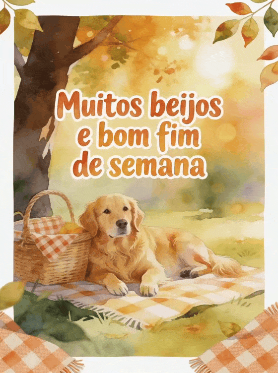 Deseje um fim de semana alegre com letras divertidas, um cachorro golden retriever sob uma árvore iluminada pelo sol, uma cesta de piquenique e um cobertor xadrez. Veja também gif bom fim de semana beijos grandes, bom fim de semana borboleta beijos ou gif bom fim de semana beijinhos.
