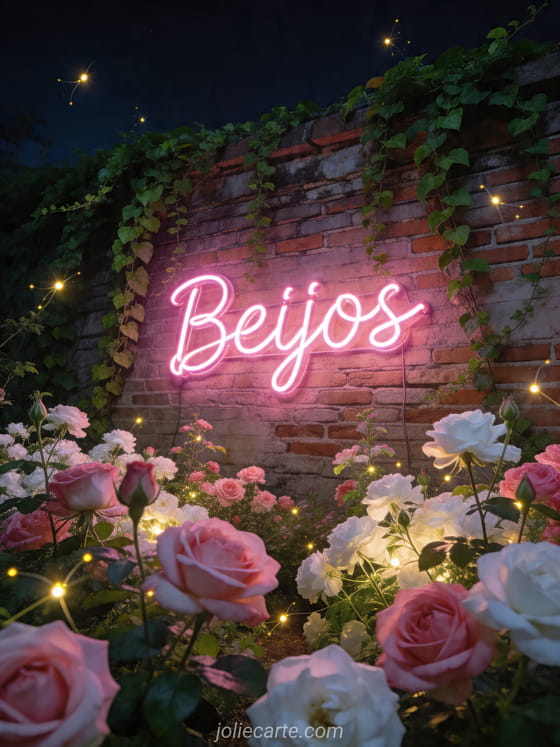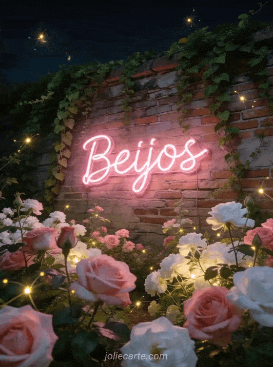 Compartilhe uma terna mensagem de beijos com este romântico cartão que mostra malvas-rosas cor-de-rosa e brancas brilhando em um jardim noturno com vaga-lumes. Você também pode descobrir beijos de amor casal, imagem beijos ou beijos gif.