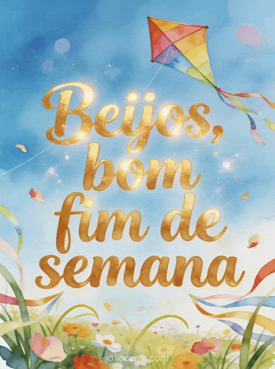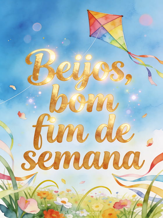 Compartilhe uma sensação despreocupada de fim de semana com uma pipa colorida sobre uma campina florida, ervas curvas, pétalas ao vento e fitas em um céu luminoso de aquarela. Você também pode enviar muitos beijos bom fim de semana, bom fim de semana animado beijos ou bom fim de semana beijos grandes.