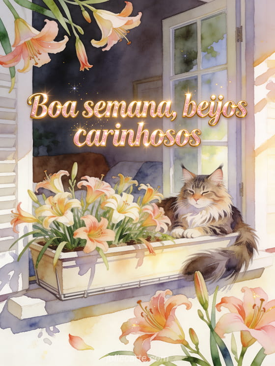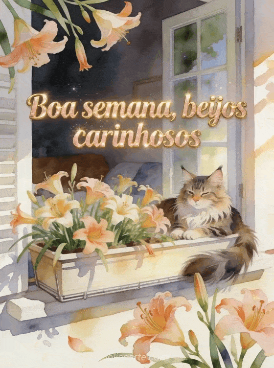 Deseje uma boa semana com letras em ouro rosé, um gato Maine Coon descansando ao lado de uma floreira iluminada pelo sol e hemerocális em luz dourada. Veja também um cartão de boa semana a todos beijos imagens, um cartão de boa semana beijos gifs animados ou um cartão de linda semana beijos.