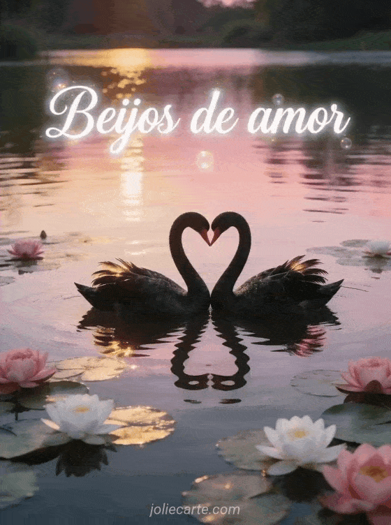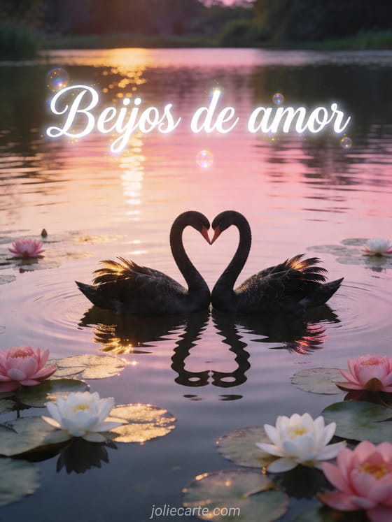 Compartilhe uma romântica mensagem de beijos de amor com este elegante cartão de dois cisnes formando um coração com seus pescoços sobre um lago brilhante. Você também pode descobrir imagem beijos, beijos gif ou logos animados beijos.