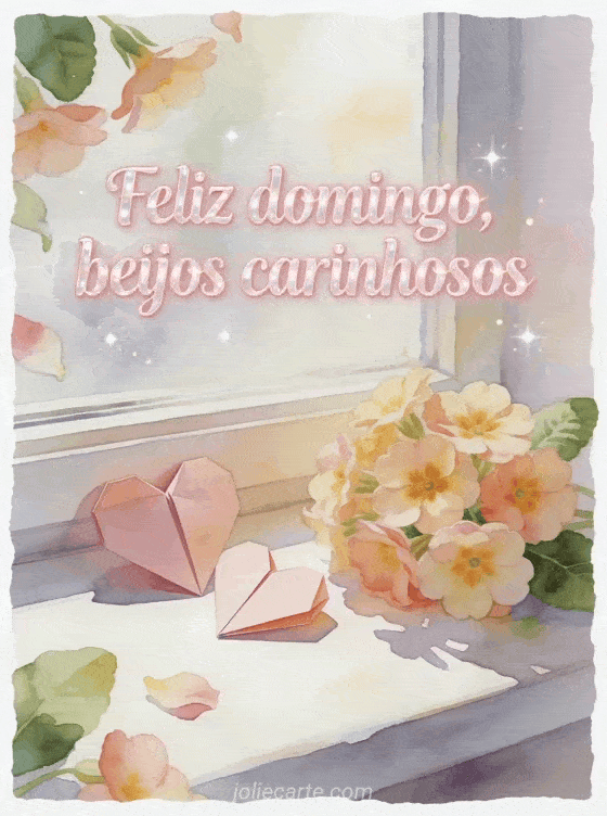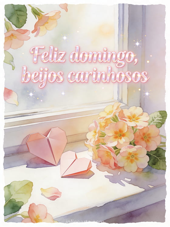 Envie feliz domingo, beijos carinhosos com letras rosadas, corações de papel dobrados e flores de prímula em uma janela iluminada. Veja também feliz domingo cartão, texto curto para desejar um feliz domingo ou feliz domingo cartões virtuais.