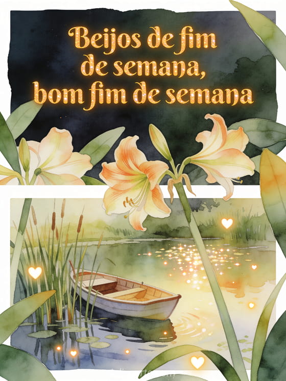Compartilhe beijos carinhosos de fim de semana com amarilis realistas em aquarela, um barco tranquilo junto aos juncos e luz brilhante no lago. Veja também beijos de fim de semana, feliz fim de semana muitos beijos imagem ou bom fim de semana engraçado humor.