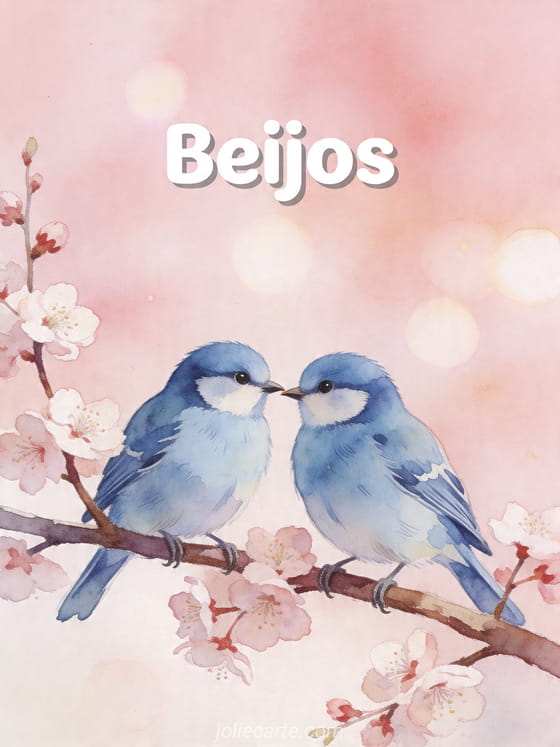 Compartilhe uma mensagem terna de beijos com este delicado cartão de dois chapins-azuis tocando os bicos em um galho de cerejeira em flor. Você também pode descobrir logos animados beijos, gif coelho beijinhos ou envio beijinhos.