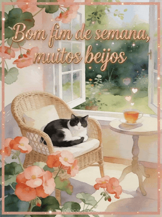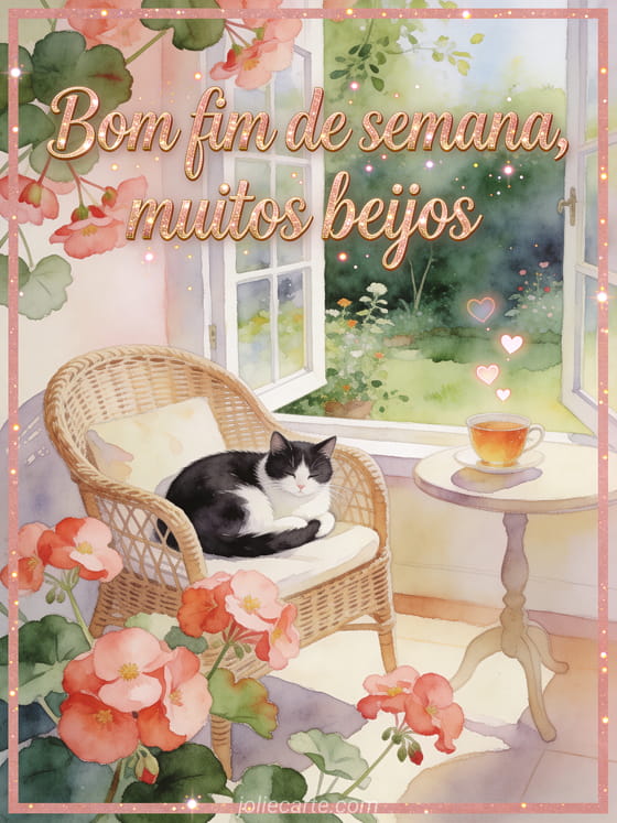 Deseje um fim de semana tranquilo com letras ouro rosé, begônias sobre a borda e um gato preto e branco enrolado em uma poltrona de rattan ao lado de uma janela aberta para o jardim. Você também pode enviar bom fim de semana e beijos imagem, beijo grande bom fim de semana beijos ou gif bom fim de semana beijos grandes.