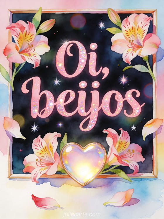 Envie um oi terno com beijos em letras rosa brilhantes, glitter delicado, flores de alstroeméria, pétalas soltas, um enfeite de coração polido, luz pastel e acentos de estrelas cintilantes. Você também pode compartilhar oi beijos a todos, oi clipart ou um beijinho de passagem.