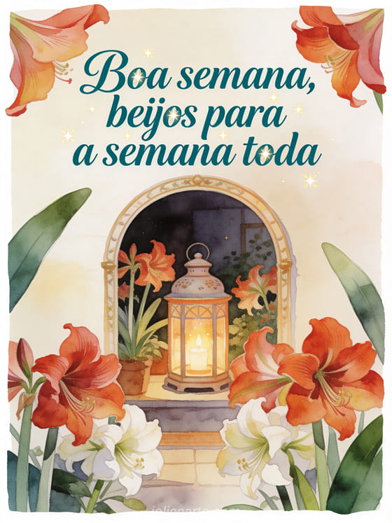 Compartilhe um cumprimento caloroso de boa semana com escrita verde-petróleo profunda, uma lanterna de cerâmica, um arco aconchegante e flores abundantes de amarilis. Veja também boa semana cartão beijos, coração beijos da semana ou belas imagens boa semana beijos.
