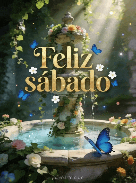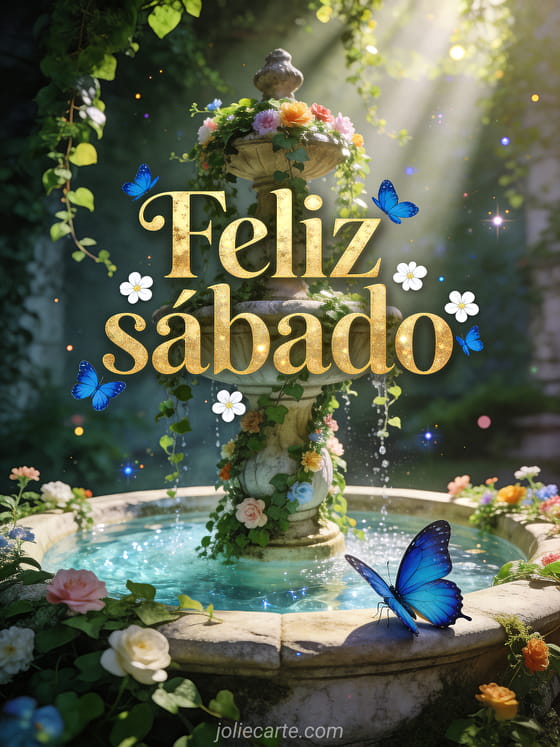 Envie uma saudação encantadora de feliz sábado com letras douradas antigas, flores brancas, borboletas azuis e uma fonte antiga coberta de hera com água cristalina e uma borboleta morpho azul. Veja também este feliz sábado e bom fim de semana beijos, este bom dia feliz sábado ótimo dia ou esta feliz sábado bom fim de semana imagem.