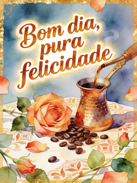 Compartilhe um momento rico de manhã com este cartão em aquarela, com uma cezve de cobre, aroma de café, uma rosa aberta e grãos sobre tecido estampado. Veja também bom dia bom café, bom dia café beijos gif ou bom dia café coração gif.