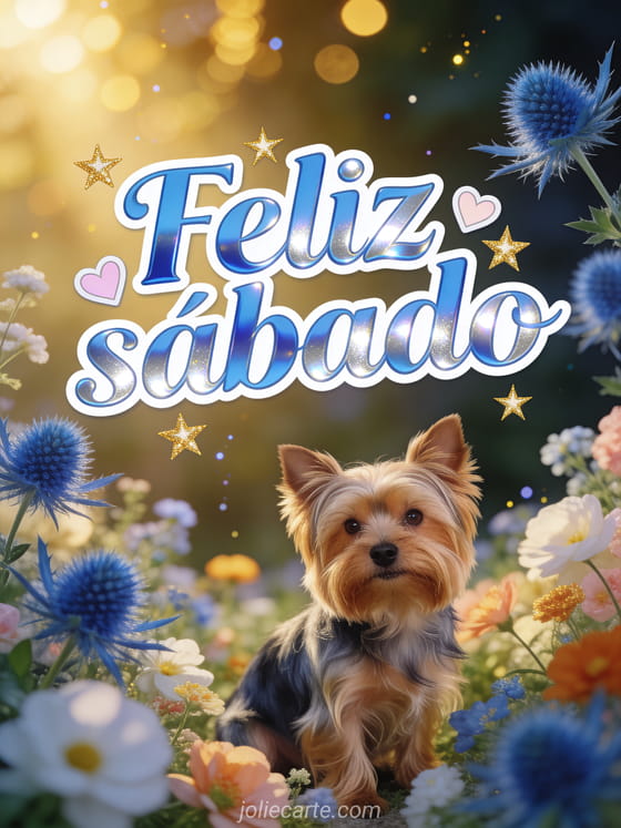 Envie uma bela imagem de feliz sábado com cardos azuis, corações em tons pastel e uma luz dourada acolhedora. Compartilhe um desejo delicado de fim de semana e veja também um feliz sábado bom fim de semana beijos, uma feliz sábado imagem animada ou uma bom sábado e bom fim de semana citação.