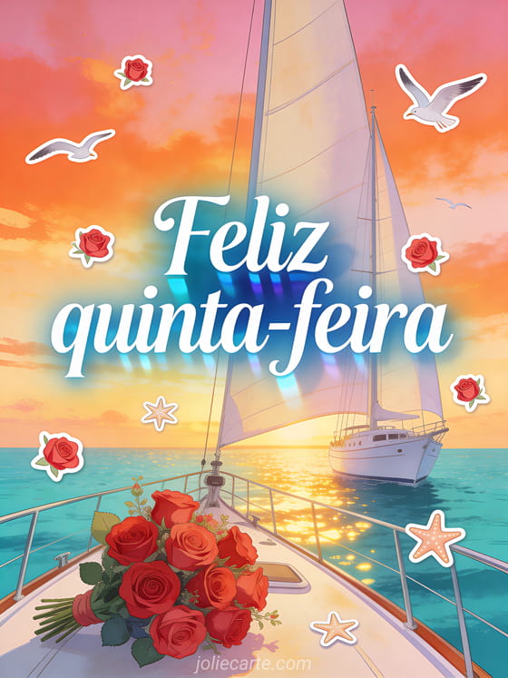 Deseje feliz quinta-feira com letras brancas elegantes, reflexos azul-oceano, rosas vermelhas, estrelas-do-mar, um veleiro branco em águas turquesas tranquilas, gaivotas e céu de pôr do sol. Veja também feliz quinta-feira citação imagens, bom dia de quinta-feira ou bom dia é quinta-feira em imagem.
