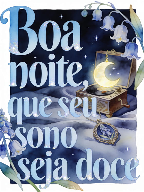 Compartilhe uma mensagem delicada de boa noite com letras azul-claro em aquarela, bordas cintilantes, sinos de jacinto e folhas, uma caixa de música antiga, um enfeite de lua luminoso, céu noturno aveludado e pequenas estrelas. Você também pode enviar uma mensagem para dizer boa noite, uma mensagem de boa noite para amiga ou uma mensagem romântica de boa noite.