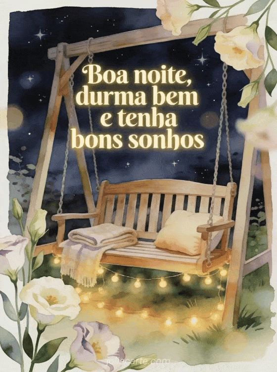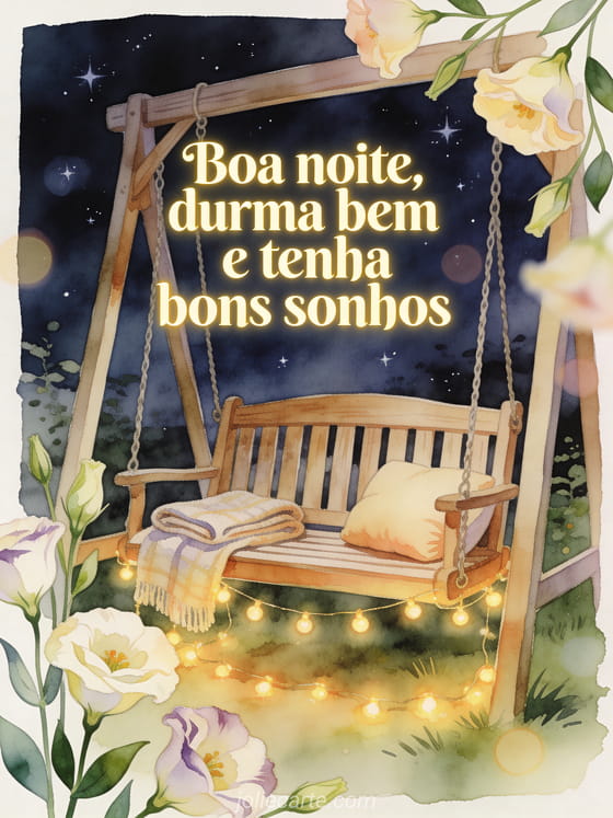 Compartilhe um cartão tranquilo de boa noite com um balanço de madeira no jardim, um cobertor dobrado, uma almofada macia, luzes de cordão e flores de lisianto sob um céu estrelado. Você também pode enviar uma mensagem para desejar boa noite à sua esposa, uma mensagem para desejar boa noite à sua namorada ou um cartão de boa noite grátis.