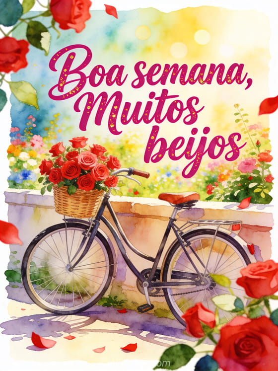 Compartilhe um desejo luminoso de boa semana com letras fúcsia vivas, uma bicicleta charmosa, uma cesta cheia de rosas vermelhas e um muro ensolarado de jardim. Veja também beijos carinho boa semana, boa semana a todos beijos imagens ou boa semana beijos gifs animados.
