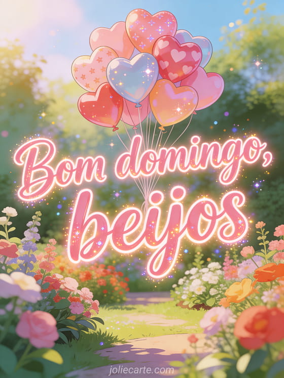 Envie beijos de bom domingo com um grupo de balões em forma de coração subindo acima de jardins floridos em uma paleta ensolarada. Veja também cartão bonito feliz domingo ensolarado, bom domingo chuvoso ou bom domingo gifs animados.