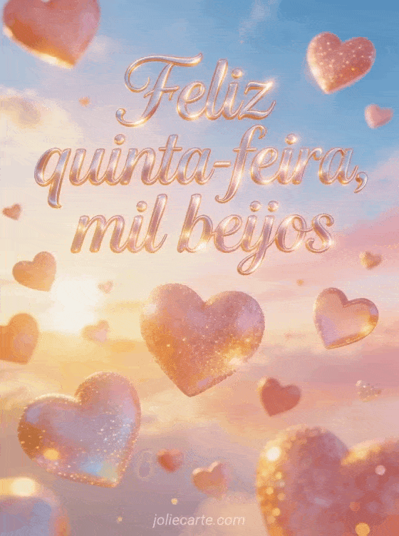 Compartilhe mil beijos de feliz quinta-feira com cursiva delicada, brilho reluzente, muitos corações flutuando em um céu radiante da manhã, glitter suave e uma paleta calorosa. Veja também feliz quinta-feira cachorro imagem, feliz quinta-feira gato gif ou feliz quinta-feira cartão virtual.