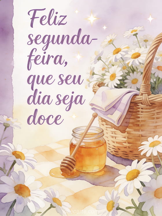 Envie um desejo suave de segunda-feira com letras lavanda, uma cesta de piquenique de vime, um guardanapo dobrado, um pote de mel e margaridas transbordando além da borda. Veja também feliz segunda-feira flores gif, uma feliz segunda-feira imagem brilhante ou uma feliz segunda-feira fria imagem.