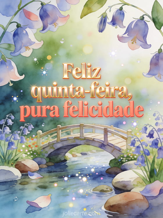 Deseje uma feliz quinta-feira cheia de felicidade com uma pequena ponte arqueada de jardim sobre um riacho claro, campânulas e pedras lisas de rio em cores luminosas de aquarela. Você também pode enviar uma feliz quinta-feira ensolarada imagem, imagens para boa quinta-feira ou um feliz quinta-feira poema.