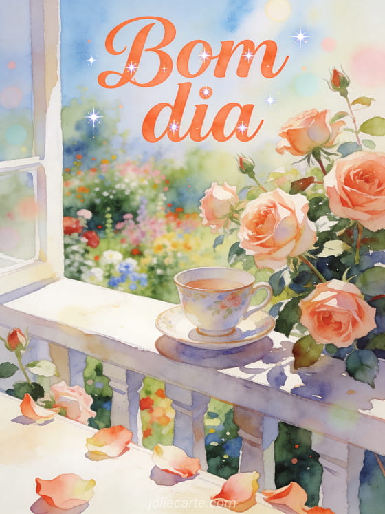 Envie um belo cartão virtual gratuito de bom dia com letras coral elegantes em aquarela, uma xícara de porcelana, rosas antigas de jardim e uma varanda iluminada. Veja também cartões virtuais gratuitos de bom dia, bom dia e melhores votos ou pequena mensagem para bom dia.