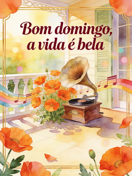 Compartilhe bom domingo, a vida é bela com letras bordô, um gramofone vintage em uma varanda ensolarada, papoulas brilhantes e fitas musicais coloridas. Veja também bom domingo coração gif, bom dia domingo imagens ou imagens de domingo muito feliz.