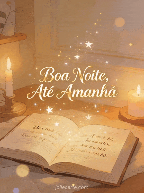 Envie uma inspiradora frase de boa noite até amanhã com este cartão grátis com um livro mágico aberto e palavras flutuando como estrelas. Descubra também boa noite até amanhã imagens ou boa noite até amanhã beijos gif.