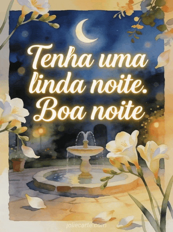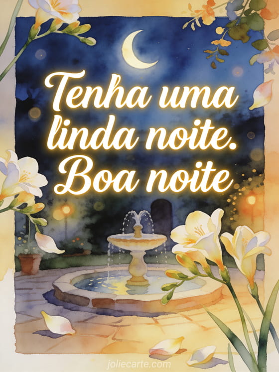 Envie tenha uma linda noite e boa noite com um cartão em aquarela que mostra uma lua crescente, uma pequena fonte de pátio, flores de frésia e um azul noturno tranquilo. Veja também um cartão online boa noite, um cartão virtual boa noite bom descanso ou uma linda mensagem de boa noite.