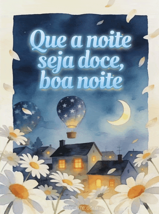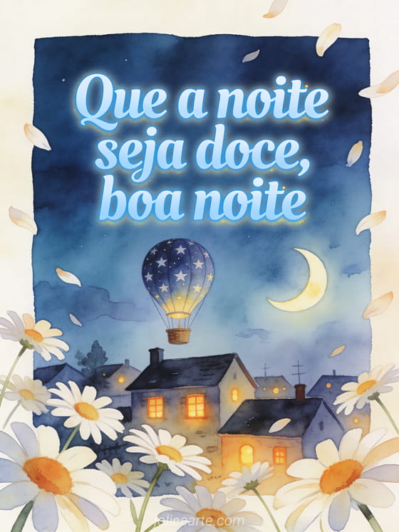 Envie uma mensagem suave de boa noite com um pequeno balão de ar quente com estrelas sobre um vilarejo dormindo, uma lua crescente e pétalas de margarida flutuando. Veja também uma mensagem fofa de boa noite, cartões boa noite e boa noite ou desejos de boa noite.