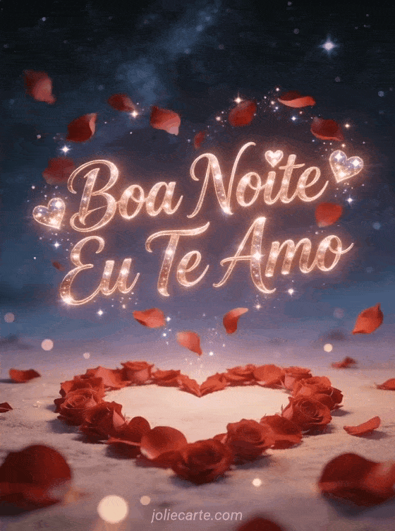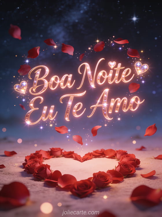 Envie um apaixonado cartão de boa noite para sua pessoa especial com este lindo cartão grátis. Pétalas de rosa formando um coração sob um céu estrelado, perfeito para expressar seus sentimentos mais profundos. Descubra também um cartão boa noite único amor ou um cartão eu te amo boa noite meu amor.