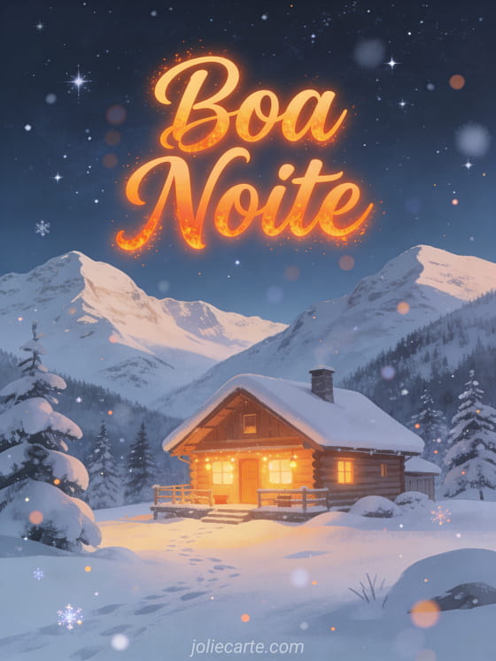 Envie um aconchegante gif de boa noite amor com este lindo cartão grátis. Uma cabana aconchegante com luzes brilhantes encravada em montanhas nevadas sob um céu estrelado de inverno, para uma boa noite tranquila e romântica. Descubra também um cartão boa noite meu bem mensagem de amor ou um cartão desejar boa noite ao seu amor imagem.