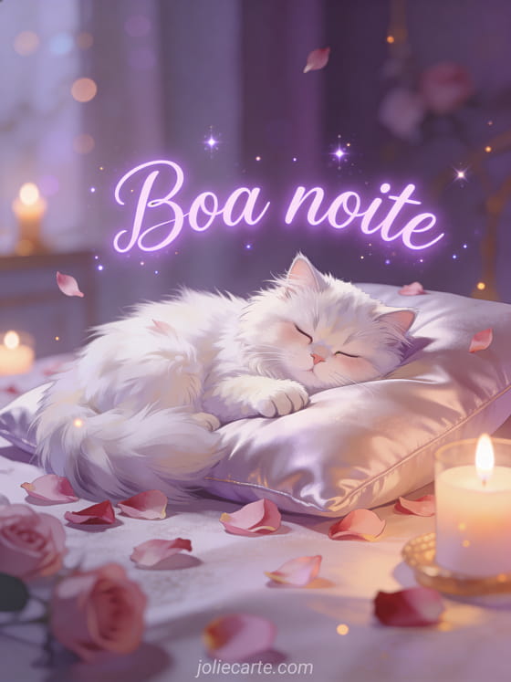 Envie uma serena mensagem de amor de boa noite com este lindo cartão grátis. Um fofo gato persa branco dormindo tranquilamente sobre pétalas de rosa com suaves velas acesas, para uma boa noite romântica e serena. Descubra também um cartão palavras de amor para dizer boa noite ou um cartão boa noite meu querido mensagem de amor.