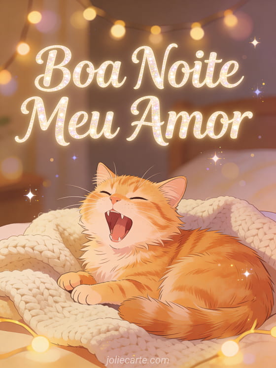 Envie uma terna mensagem de boa noite meu amor com este aconchegante cartão grátis. Um adorável gato ruivo bocejando em uma manta de tricô com luzes, perfeito para uma mensagem de boa noite calorosa. Descubra também um cartão boa noite eu te amo meu amor ou um cartão boa noite único amor.
