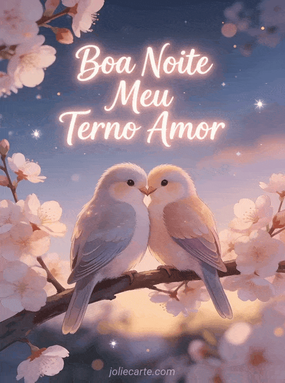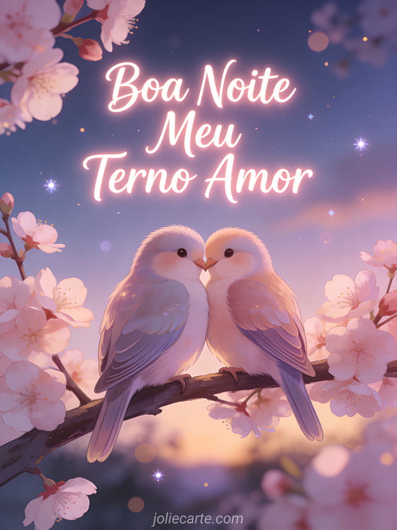 Envie um ternoso boa noite meu amor terno com este lindo cartão grátis. Dois pássaros inseparáveis aninhados juntos num galho de cerejeira em flor ao crepúsculo, para uma boa noite suave e afetuosa. Descubra também um cartão boa noite gif amor ou um cartão boa noite meu bem mensagem de amor.