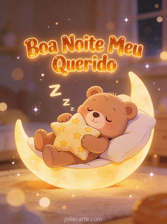Envie uma terna mensagem de boa noite meu querido com este adorável cartão grátis. Um lindo ursinho abraçando um travesseiro em forma de estrela numa cama de lua crescente, para uma boa noite terna e calorosa. Descubra também um cartão boa noite amor da minha vida ou um cartão boa noite meu amor mensagem.