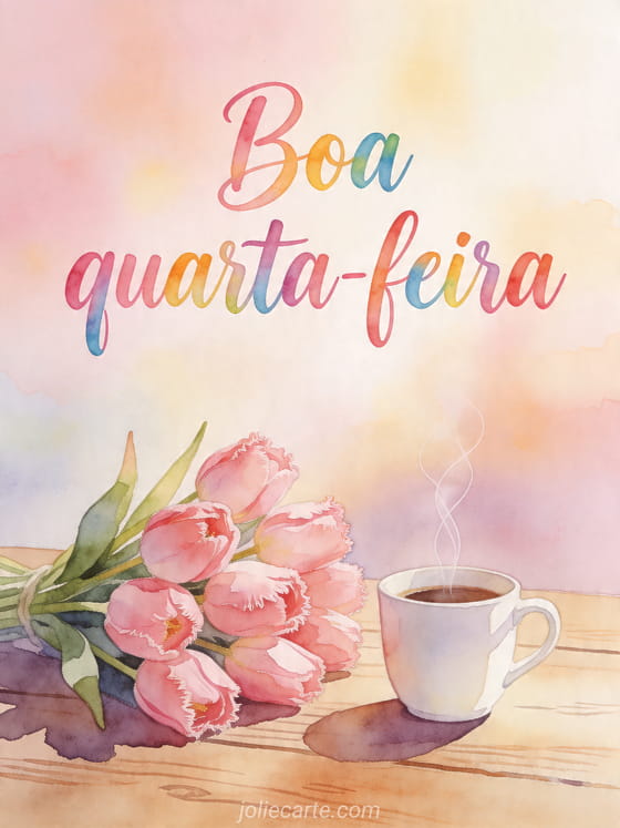 boa quarta-feira uma mensagem acolhedora de quarta-feira com café, flores e luz dourada da manhã