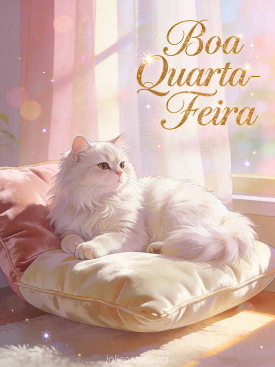 Deseje a alguém uma boa quarta-feira com este terno cartão com um fofo gato persa branco numa almofada de veludo. Veja também humor bom dia feliz quarta ou imagem feliz quarta amigos.