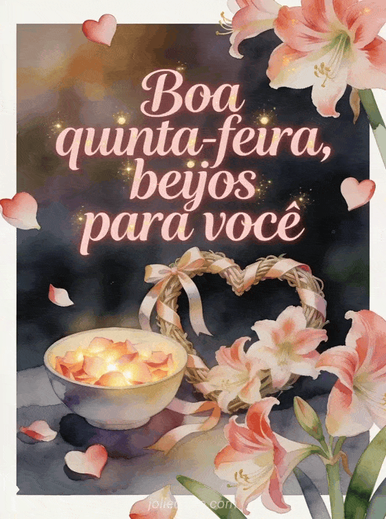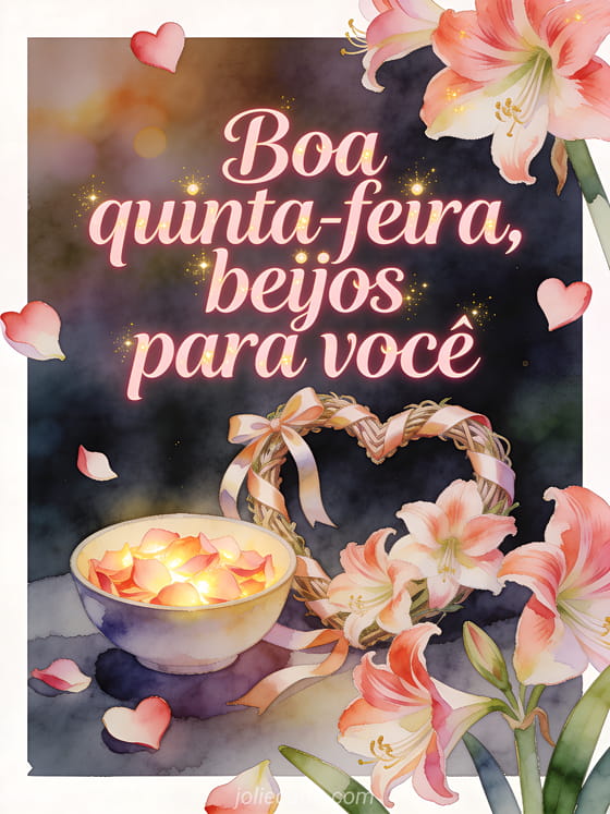 Envie boa quinta-feira beijos imagens com letra rosa, uma coroa de coração feita de fita, flores de amarilis e uma tigela de pétalas brilhantes. Veja também bom dia boa quinta-feira paisagem, linda quinta-feira beijos ou uma bom dia quinta-feira imagem.