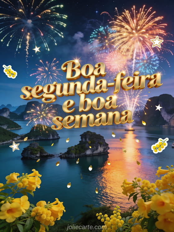 Comece a semana com uma boa segunda-feira festiva sobre a baía de Ha Long, com fogos de artifício multicoloridos, mimosas amarelas e reflexos dourados na água calma. Veja também feliz segunda-feira beijos gifs, feliz segunda-feira boa semana gifs ou gifs animados feliz segunda-feira.