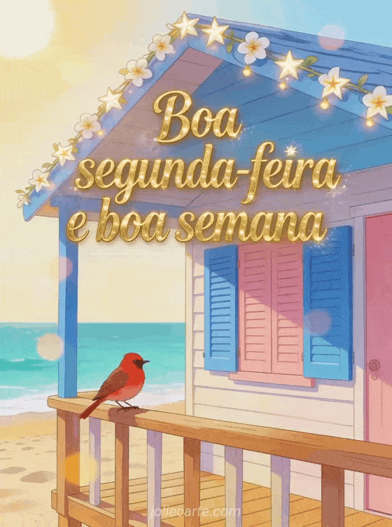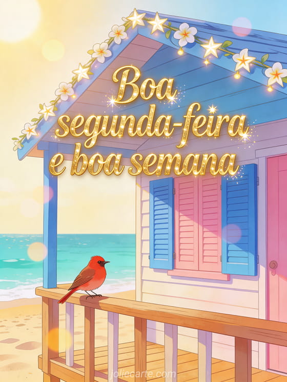 Comece a semana com energia enviando este lindo cartão de boa segunda-feira. Uma cabana de praia colorida, um simpático pintarroxo e guirlandas de jasmim sob o sol de verão. Descubra também um cartão de segunda com humor ou um cartão de boa segunda com beijos.