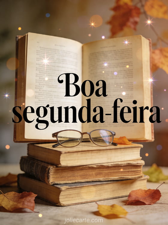 Compartilhe um cartão de Boa segunda-feira com livros antigos, óculos de leitura e folhas de outono para começar com calma. Veja também engraçado gif boa segunda-feira humorístico, bom dia e boa segunda-feira e força engraçada boa segunda-feira.