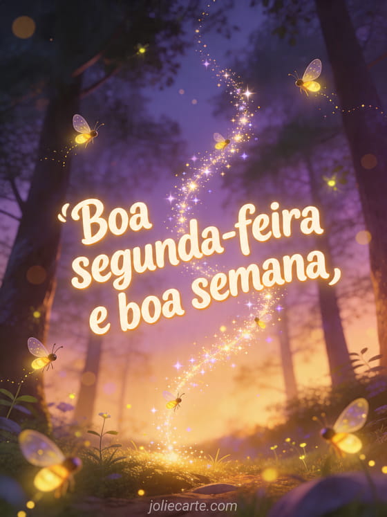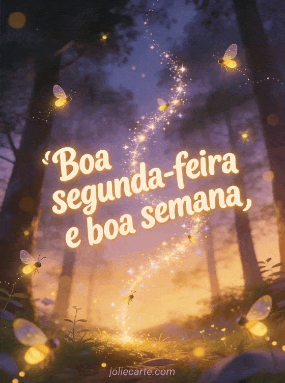 Compartilhe um cartão mágico de Boa segunda-feira com vaga-lumes dançando em uma floresta ao entardecer para um começo encantador. Veja também boa segunda-feira citação, engraçado gif boa segunda-feira humorístico e bom dia e boa segunda-feira.