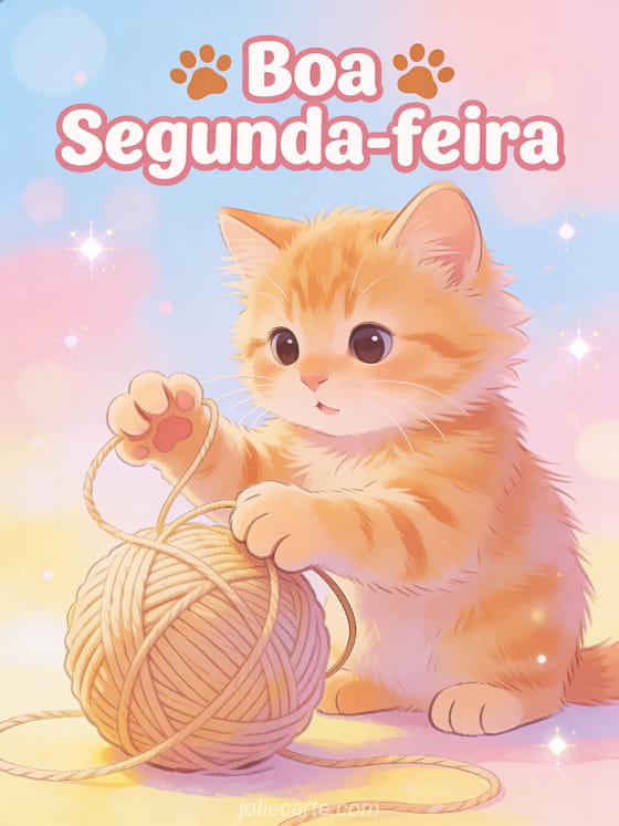 Compartilhe uma fofa boa segunda-feira com gato com um adorável gatinho laranja brincando com um novelo. O cartão perfeito para alegrar a segunda de alguém. Descubra também um cartão imagem boa segunda-feira humor ou um cartão boa segunda-feira humor beijos.