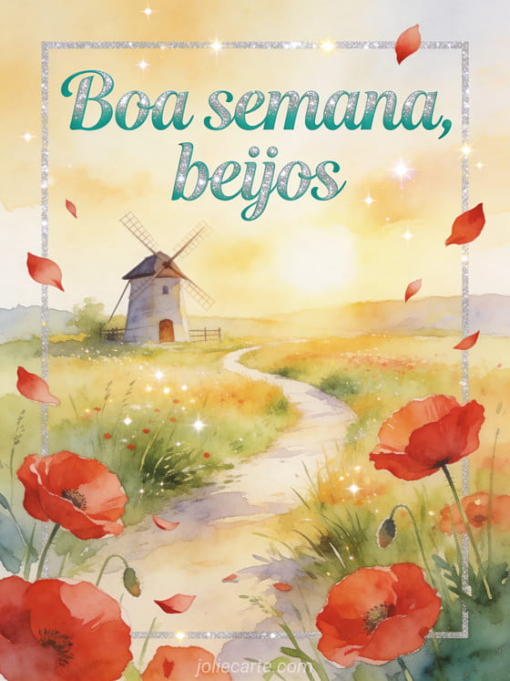 Compartilhe uma mensagem campestre e positiva com papoulas vermelhas, pétalas ao vento, um caminho ensolarado na campina e um pequeno moinho sob luz dourada suave. Você também pode enviar muito linda semana beijos, feliz segunda-feira boa semana beijos ou boa semana beijos Natal.