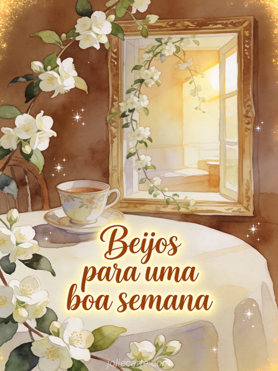 Envie beijos ternos para uma boa semana com uma xícara de porcelana, flores de jasmim pendentes e luz dourada da manhã em um cantinho de café da manhã. Veja também um linda semana beijos, um boa semana muitos beijos imagem ou um imagens boa semana.
